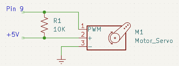 Apparently, this is a common problem, and research pointed us to a quick solution. By adding a 10K ohm resistor between the PWM and the +5V connectors, the servo position is essentially fixed during power up, correcting the problem. A diagram of the solution is shown below.