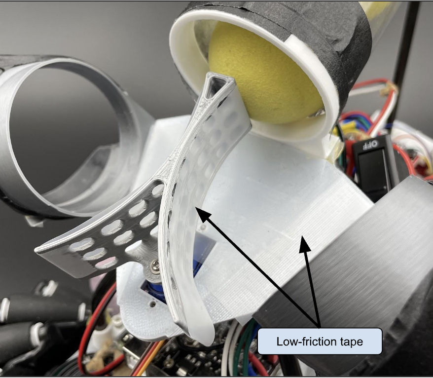 The second problem was that the balls would sometimes jam against the selector during deployment. This was attributed to two factors. First, there is a high coefficient of friction between the selector and the ball. This was mitigated by the use of low-friction tape, as seen in the image below.