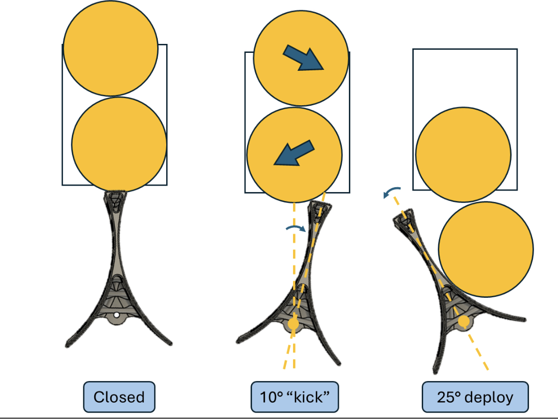This realignment sequence did help with deployment consistency, and we were able to obtain a >90% deployment reliability. However, challenges with code implementation meant that we were not able to fully overcome the geometric problems with our design.