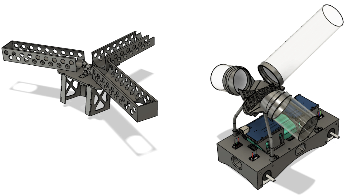 Our primary objective for the payload delivery system was to minimize or eliminate the need to orient the platform. Our final design captures this in a simple, yet effective form. Constructed from stainless steel struts, PETG tubing, and 3d printed components, the centralized hopper and curved side-selector allow for deployment to the left or right without the need to reorient -- all controlled by a single servo.