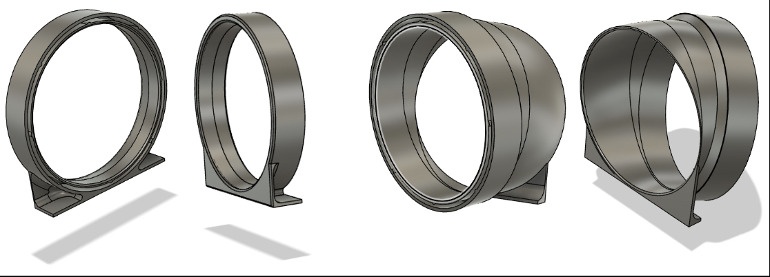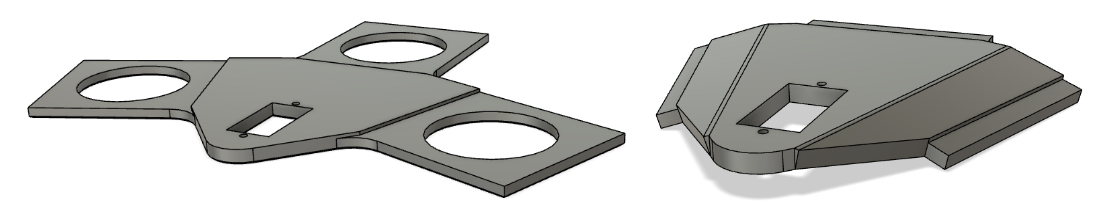 The final mounting plate, shown on the right, included improvements in weight and size, and added a slope to the delivery chute mounts to improve offload consistency from earlier designs (left).