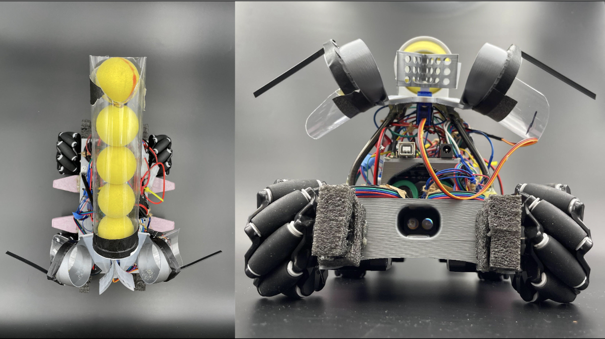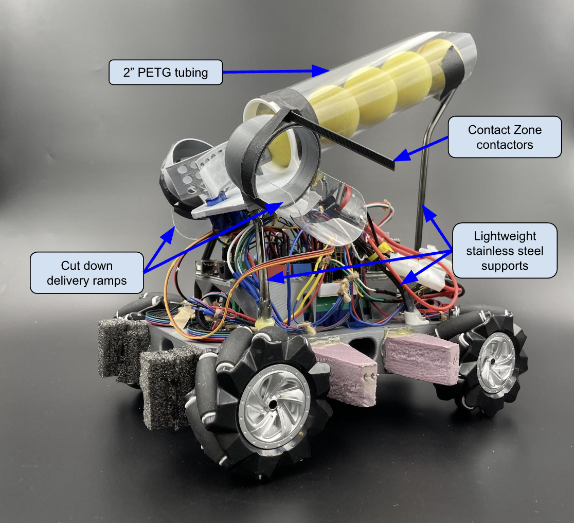 On reflection, we could have refined the relative positioning of the hopper and deployment tubes to eliminate the need for the “kick”. By increasing the distance between the hopper and deployment tubes, the diameter for the tangent circle connecting the tubes would have increased, improving the angle of incidence of the balls on the selector, and reducing energy losses due to impact and friction. However, overall, the payload delivery system proved adequately reliable, fast to offload (under 2 seconds), and incredibly fast to reload (<1 second).